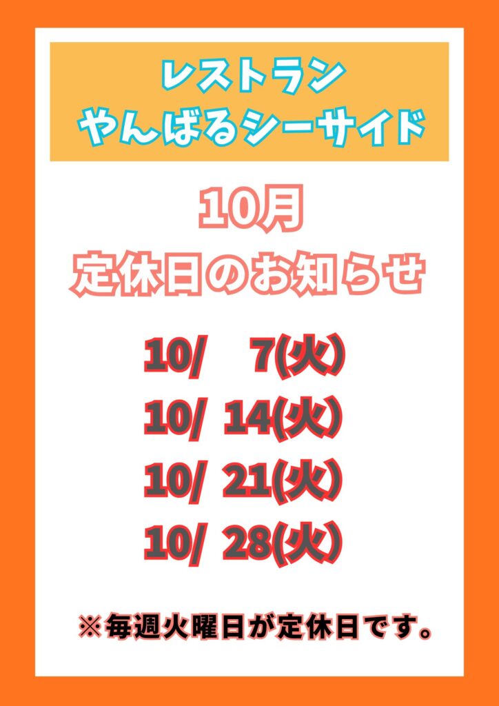 10月のレストラン・パーラー定休日のお知らせ 2025-10-3 (金) お知らせ 「レストランやんばるシーサイド」および「パーラーくがに」の 10月の定休日をお知らせいたします。 どうぞよろしくお願い申し上げます。 お知らせ一覧へ戻る