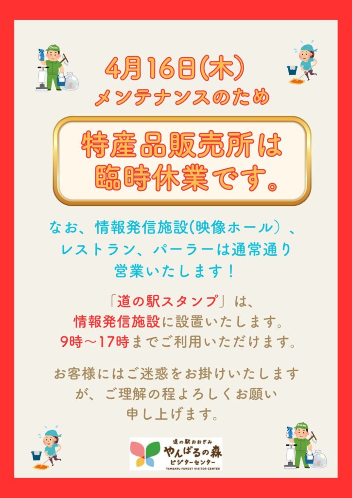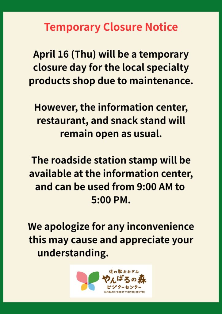 令和8年4月16日(木)は、メンテナンスのため「特産品販売施設」は