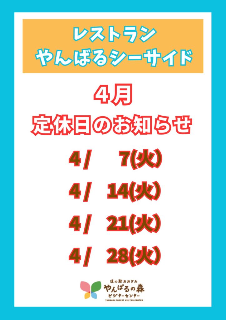 4月のレストラン・パーラー定休日のお知らせ 2026-03-30 (月) お知らせ 4月の「レストランやんばるシーサイド」および「パーラーくがに」の 定休日は以下の通りです。 どうぞよろしくお願い申し上げます。 お知らせ一覧へ戻る